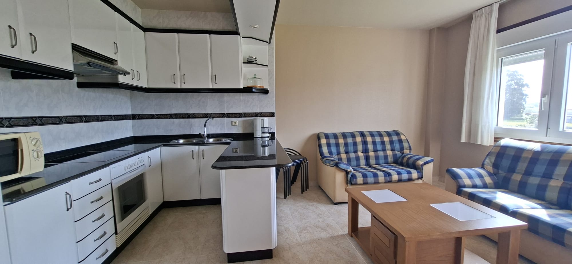 Cocina – salón totalmente equipada con: Horno, Microondas, Tostadora y Vitrocerámica.