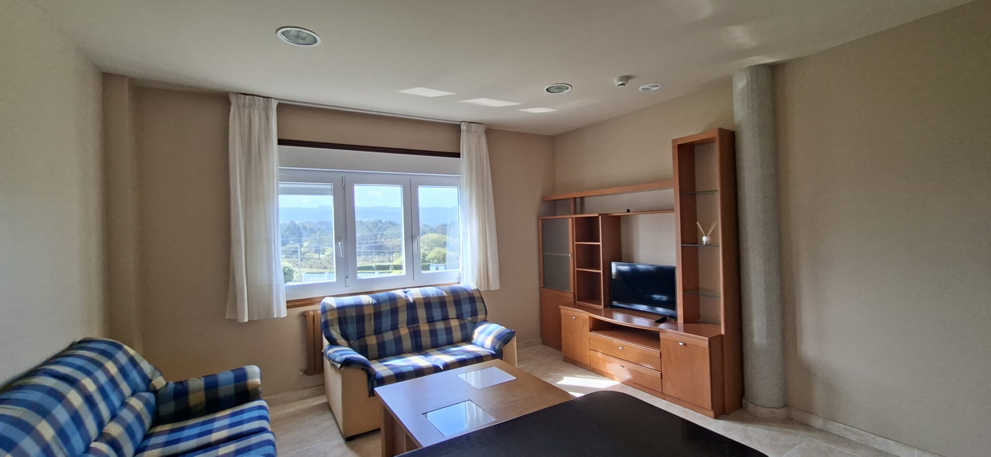Salón con sofás mesa y televisión.