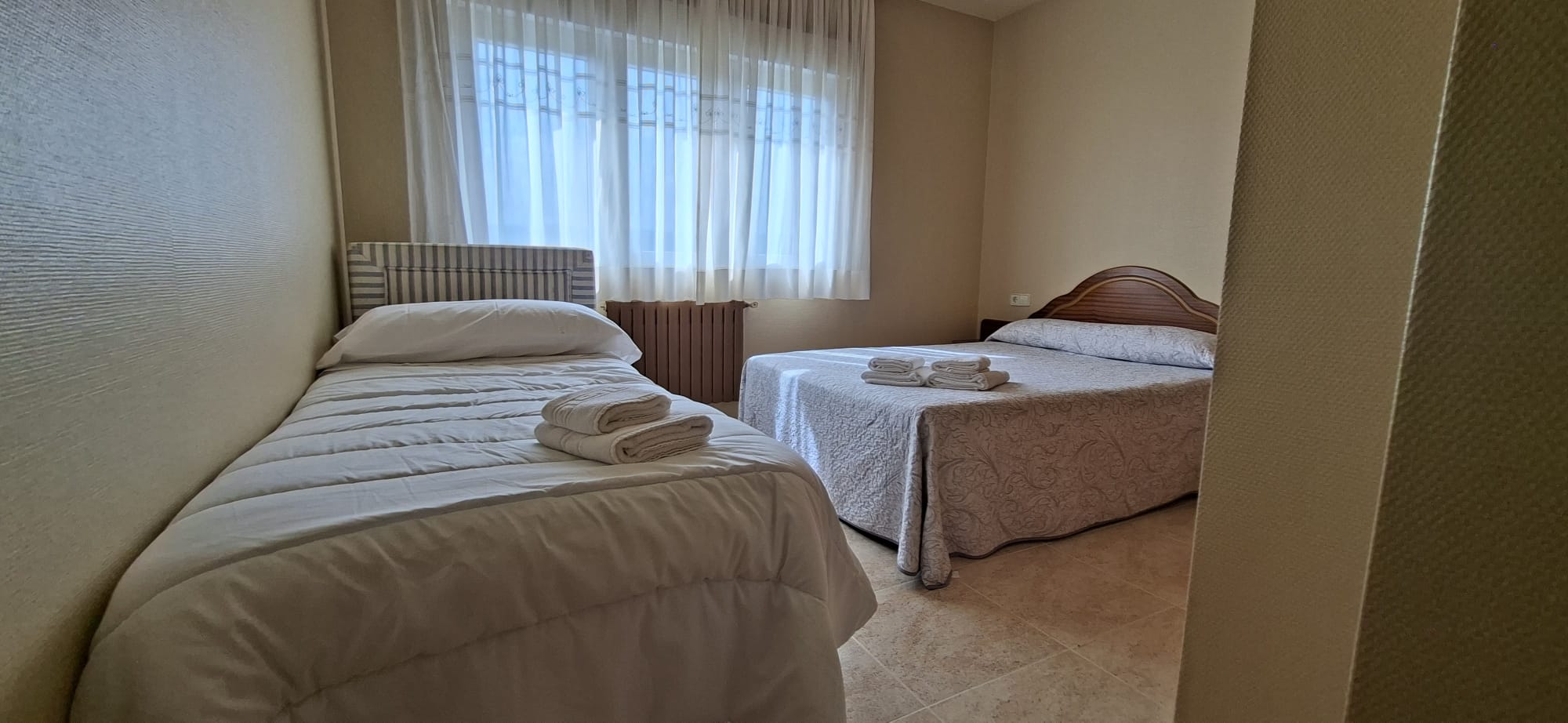 2 camas de matrimonio de 135 cm y una cama supletoria de 80 cm.